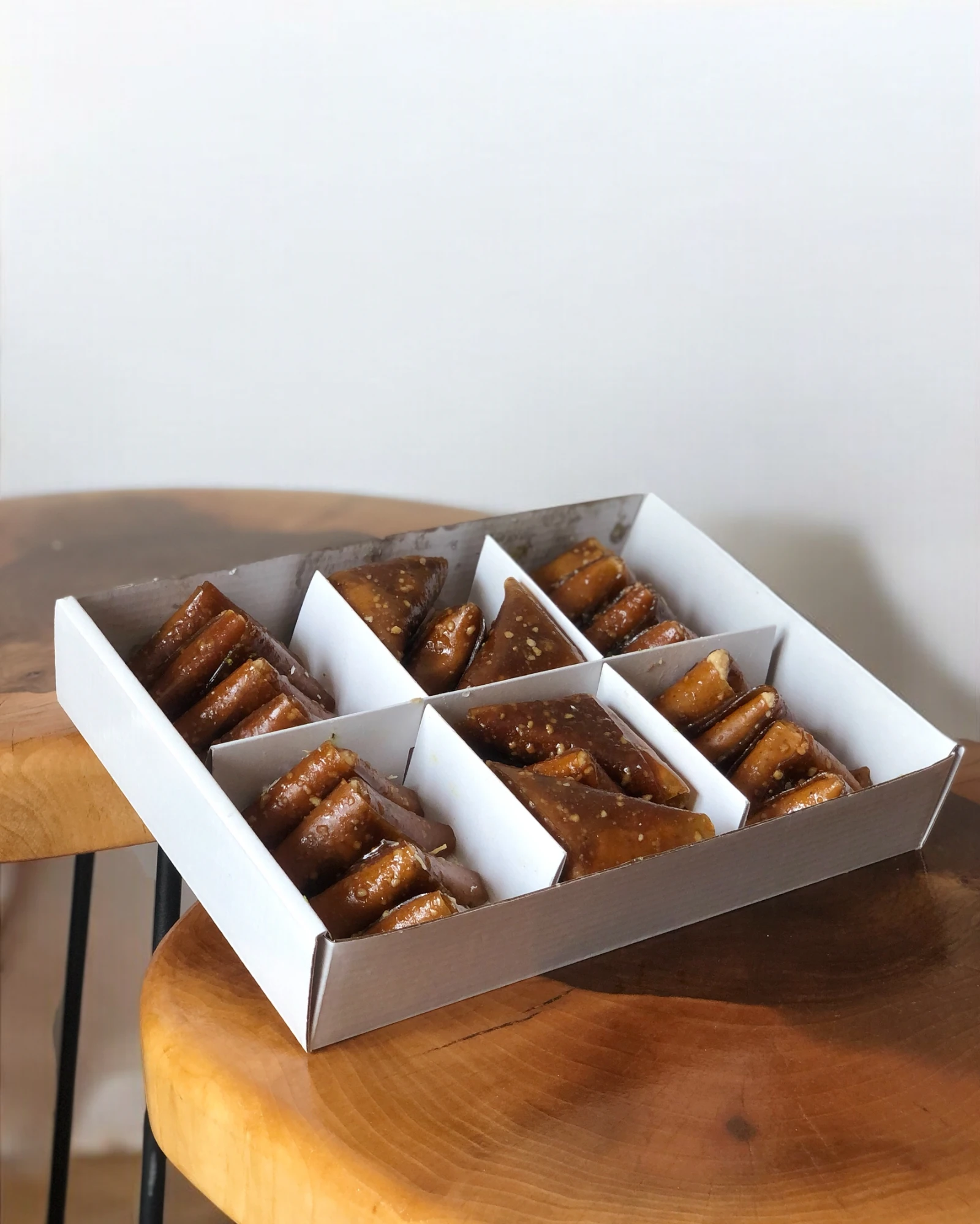 Fındık Ezmesi içeren muska, geleneksel pestil lezzetini modern bir dokunuşla sunar. Hem doğal hem de sağlıklı bir tatlı alternatifi olarak, özellikle tatlı ihtiyacı duyduğunuz anlarda sizi tatmin edecek bir seçenek sunar. Muska, şık görünümü ve eşsiz tadıyla çay saatlerinizin vazgeçilmezi ya da keyifli atıştırmalık olarak ideal bir tercihtir.
